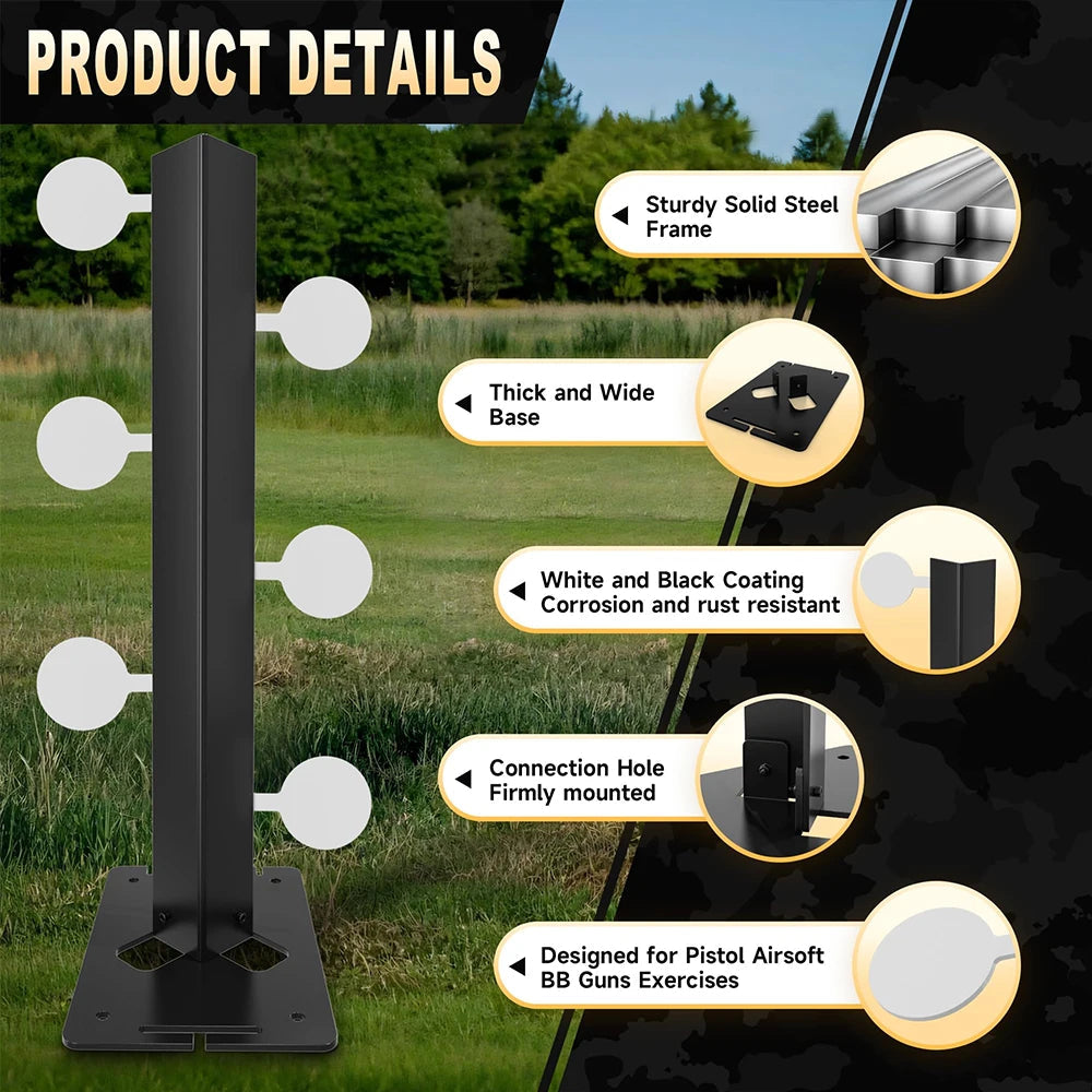 Ajoutez de la précision et du plaisir à vos entraînements grâce à ces cibles métalliques robustes au design professionnel. Deux styles disponibles : cible oscillante avec 6 plaques ou cible rotative automatique avec 8 plaques. Idéal pour l'airsoft, les carabines à air comprimé, les pistolets BB ou encore le paintball.