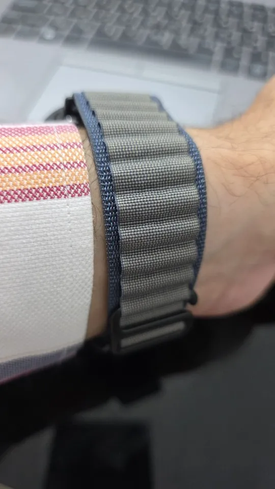 Ce bracelet est fabriqué à partir de nylon résistant, constitué de deux couches de textile tissées ensemble sans couture, renforcé par des fils à haute résistance. Le crochet en titane est résistant à la corrosion et offre un ajustement sécurisé. -