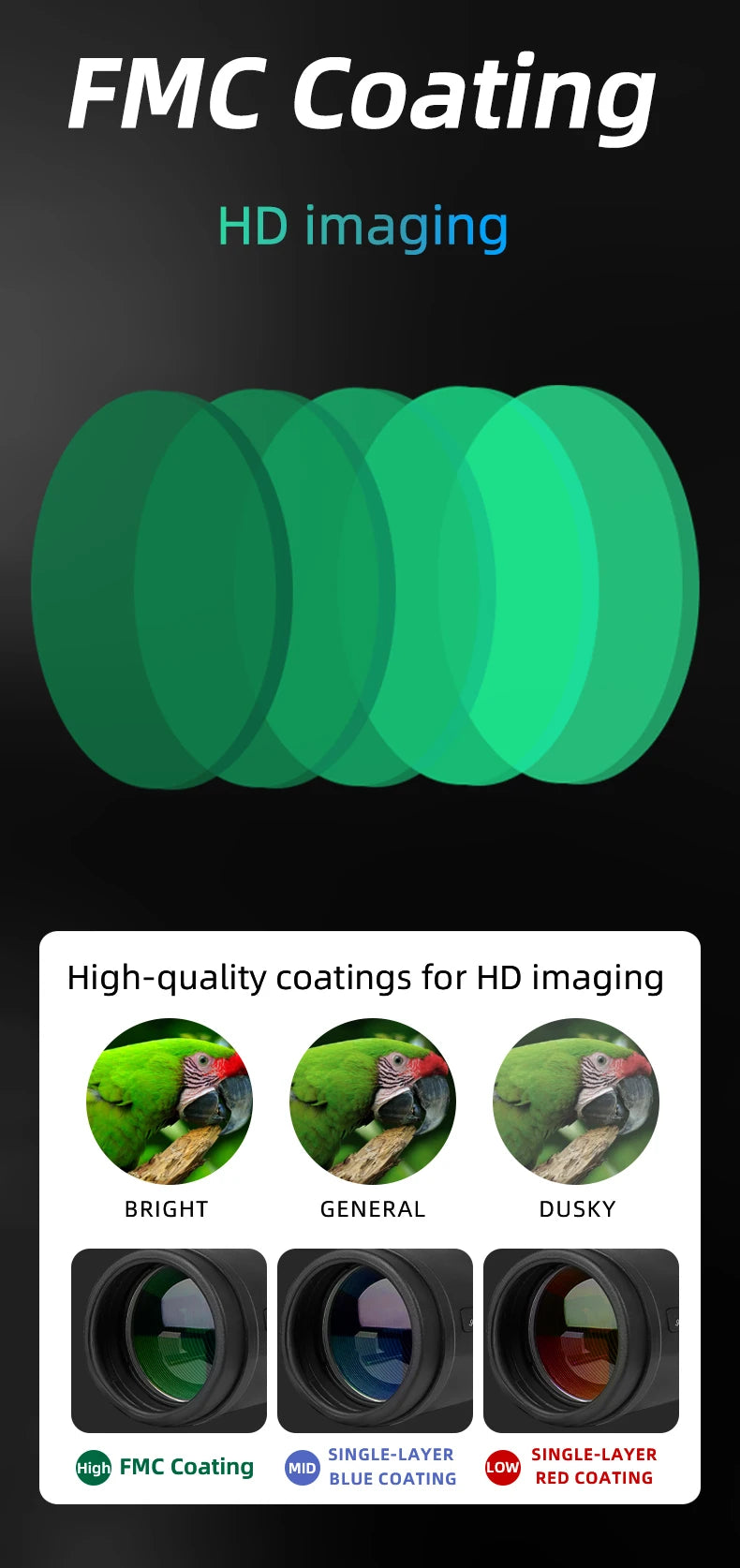 Optiques de haute qualité avec revêtements FMC pour une vision claire et lumineuse.
