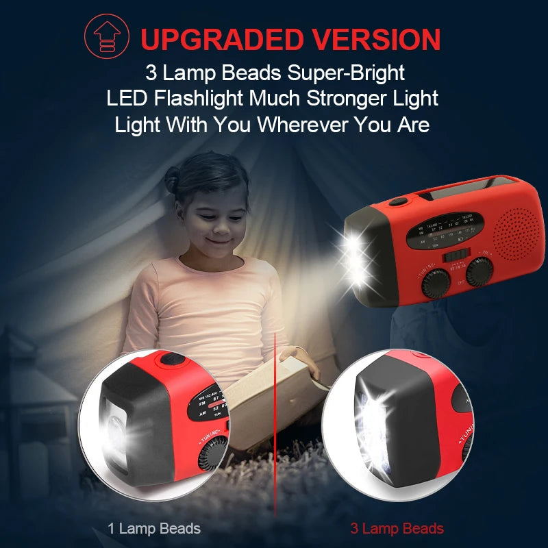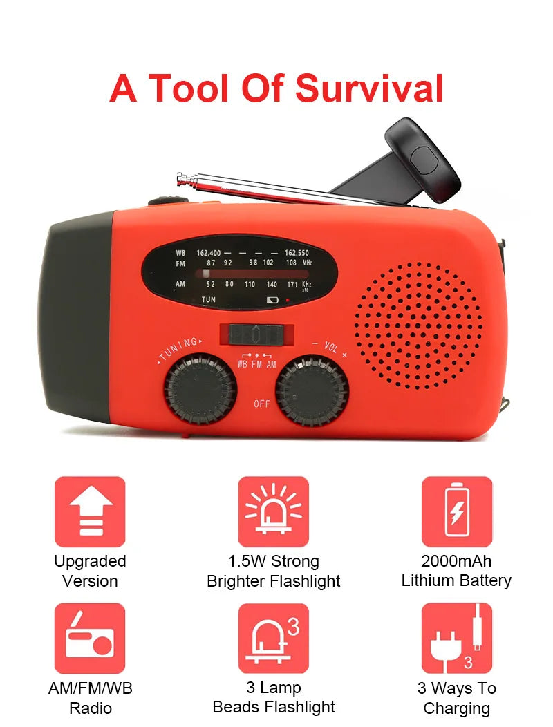 Modes de recharge flexibles : Toujours une solution de recharge disponible, que ce soit au soleil, par manivelle ou via USB.