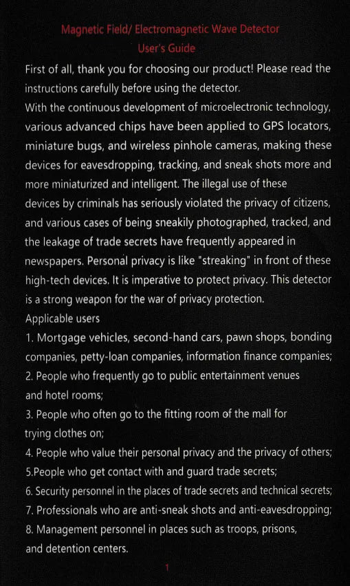Le détecteur de signaux portatif Hk-809 intègre une technologie avancée de détection des ondes électromagnétiques et des champs magnétiques, offrant une sensibilité accrue grâce à son système numérique linéaire innovant. Cette technologie permet de détecter avec précision des signaux magnétiques faibles, surpassant largement les performances des détecteurs traditionnels basés sur la technologie à lames. Conçu pour les professionnels de la sécurité, cet appareil est particulièrement efficace pour identifier les dispositifs GPS sans fil, les caméras cachées et autres équipements d’espionnage dissimulés. Sa capacité de détection magnétique s’étend jusqu’à 200 mm, garantissant une localisation fiable même dans des environnements complexes. Compact et ergonomique, le Hk-809 facilite les inspections discrètes et rapides, renforçant ainsi la protection contre les écoutes non autorisées et les intrusions électroniques. Cet outil est indispensable pour toute intervention nécessitant une détection précise et rapide des menaces électroniques.
