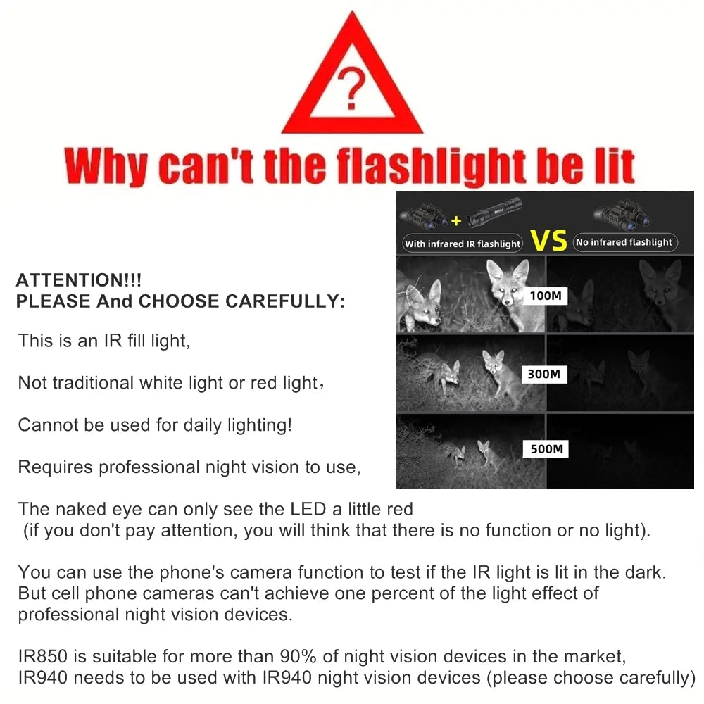Cette lampe torche infrarouge de pointe intègre une puce LED VCSEL aux longueurs d’onde 850 nm ou 940 nm, offrant une portée d’éclairage ajustable de 200 à plus de 500 mètres. Fabriquée en alliage d’aluminium aéronautique robuste et équipée d’une lentille en verre de haute qualité, elle garantit une clarté optimale et une durabilité exceptionnelle. Son zoom précis permet d’adapter le faisceau lumineux selon les besoins, tandis que ses multiples niveaux d’intensité assurent un contrôle parfait de l’éclairage. Conçue pour être compatible avec la majorité des dispositifs de vision nocturne (850 nm) ou spécifiquement avec ceux en 940 nm, elle émet une faible lueur rouge presque imperceptible à l’œil nu, préservant ainsi la discrétion lors de vos activités nocturnes. Étanche et rechargeable, cette lampe est idéale pour la chasse tactique, la surveillance ou toute autre application professionnelle nécessitant une vision nocturne performante. Son design compact et léger facilite son montage sur pistolets, fusils ou lunettes de visée. Livrée avec une batterie rechargeable 18650, un chargeur USB et un coffret de protection, elle offre une solution complète et fiable pour vos besoins en éclairage infrarouge.