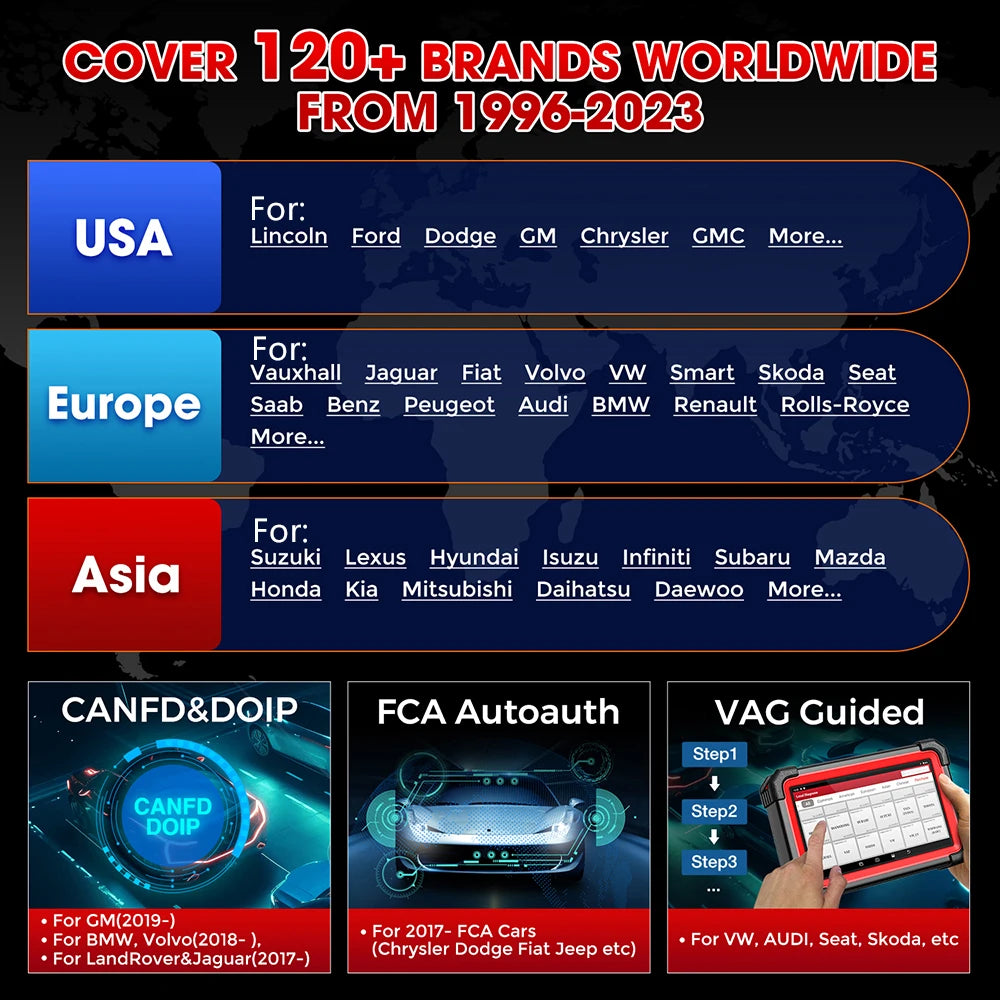 Accès à tous les modules du véhicule : Moteur, ABS, Airbag, Transmission, EPB, TPMS, SAS, BMS, ESP, etc.