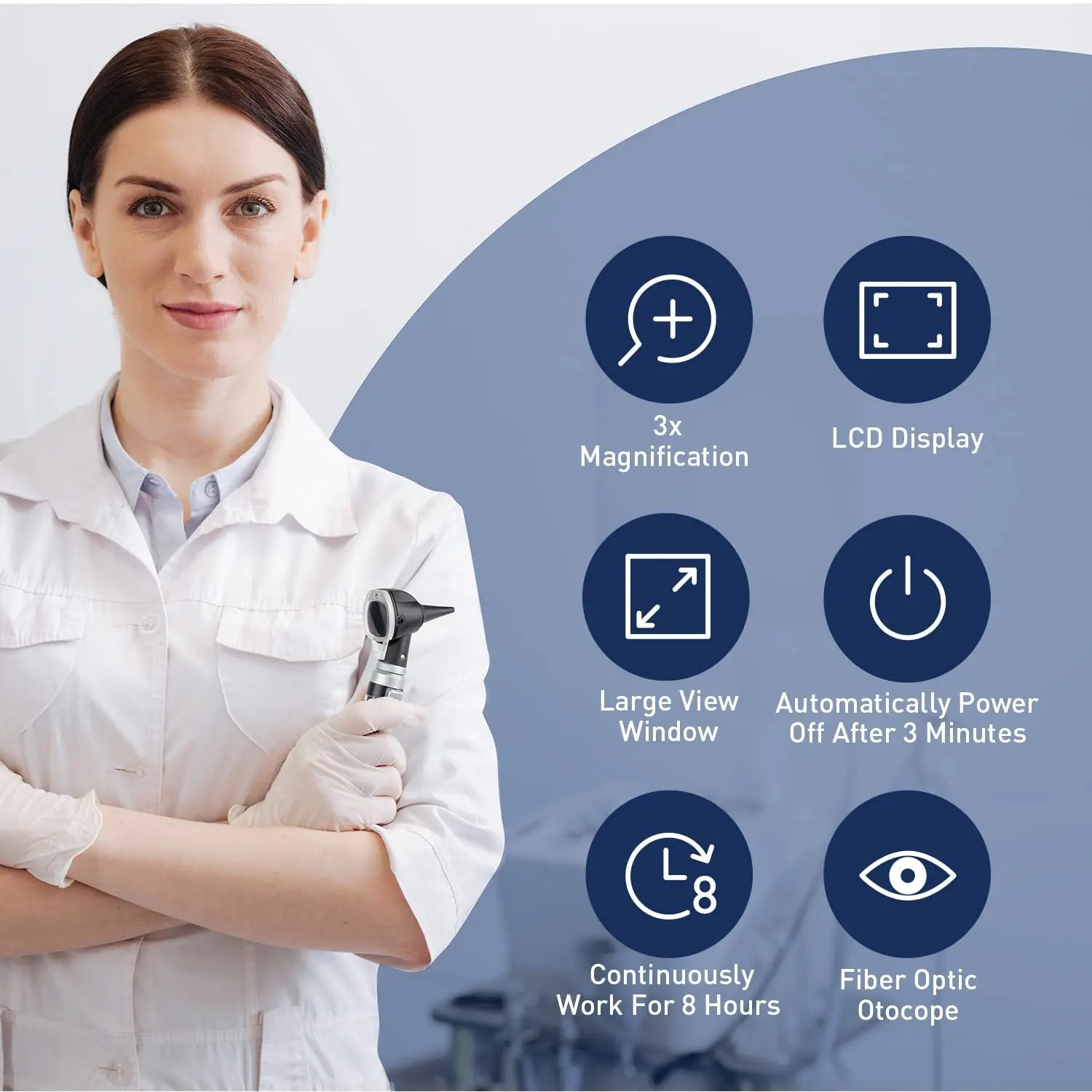 Confort et accessibilité : Léger et portable, ce kit est facile à transporter et à utiliser, que vous soyez à la maison ou en déplacement. La lentille grossissante 3X vous aide à examiner minutieusement les oreilles et détecter d’éventuels signes d'infection.