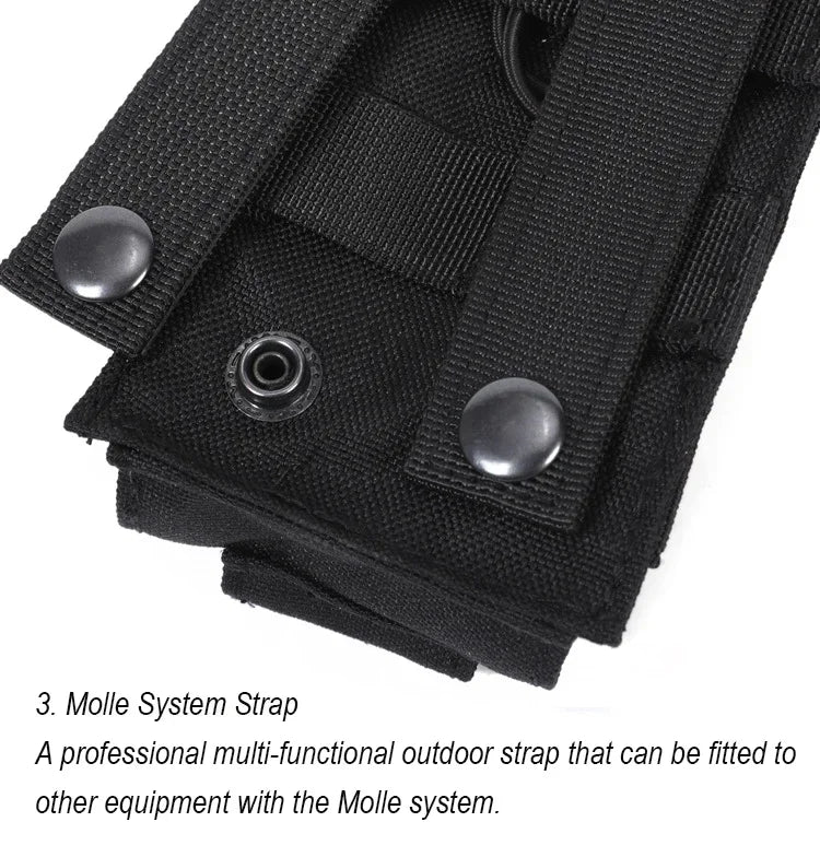Système MOLLE : La pochette est équipée d'un système MOLLE au dos, ce qui permet de la fixer facilement à des gilets tactiques, des ceintures, ou des sacs à dos, libérant ainsi vos mains pour vous concentrer sur votre mission.